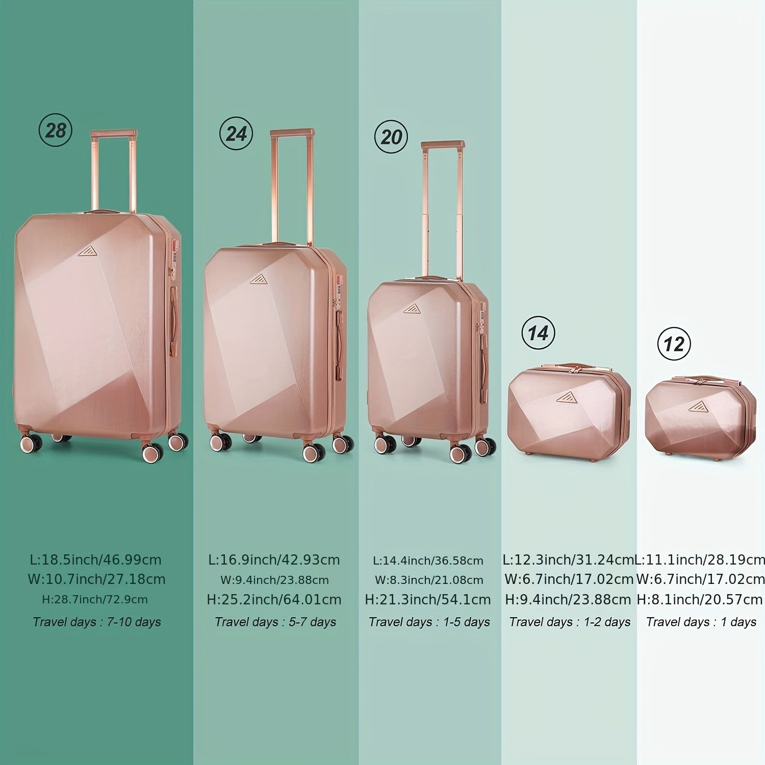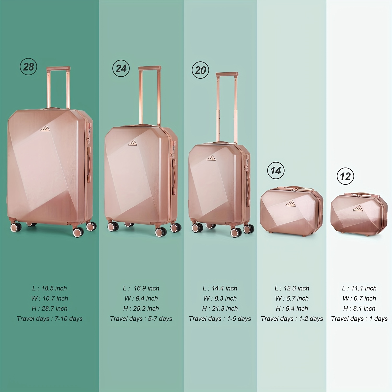 【5 Different Sizes】 This suitcase set is made of ABS material and a high-grade brushed texture is used on the surface. It is available in 5 sizes (12 inches & 14 inches & 20 inches & 24 inches & 28 inches), which meets your travel needs and make your travel easier!