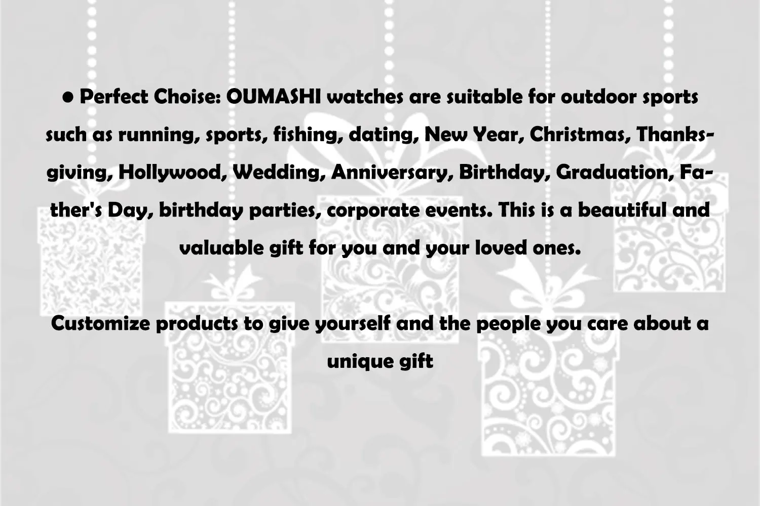 • Perfect Choise: OUMASHI watches are suitable for outdoor sports such as running, sports, fishing, dating, New Year, Christmas, Thanksgiving, Hollywood, Wedding, Anniversary, Birthday, Graduation, Father's Day, birthday parties, corporate events. This is a beautiful and valuable gift for you and your loved ones.