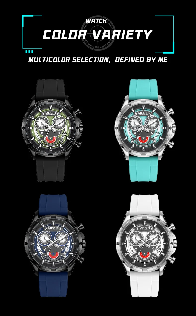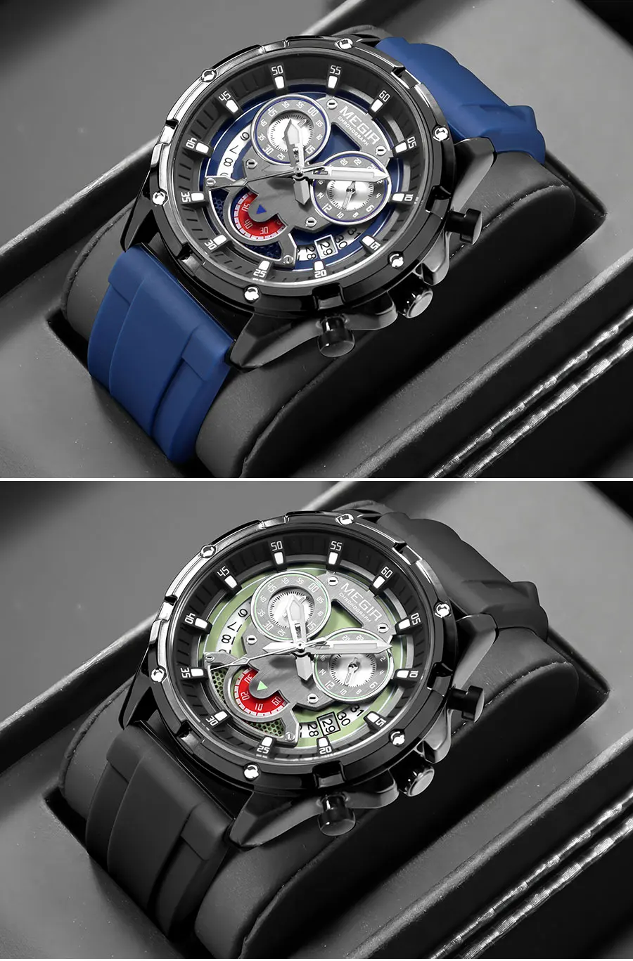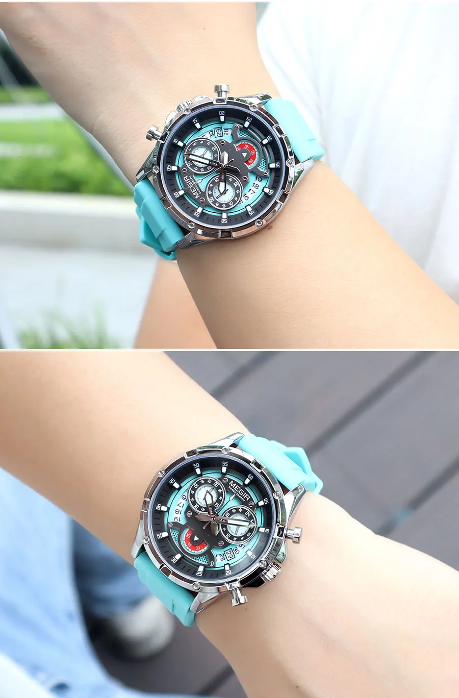 MEGIR New Sport Watches for Men Fashion Chronograph Quartz Wristwatch with Silicone Strap Luminous Hands Calendar Waterproof