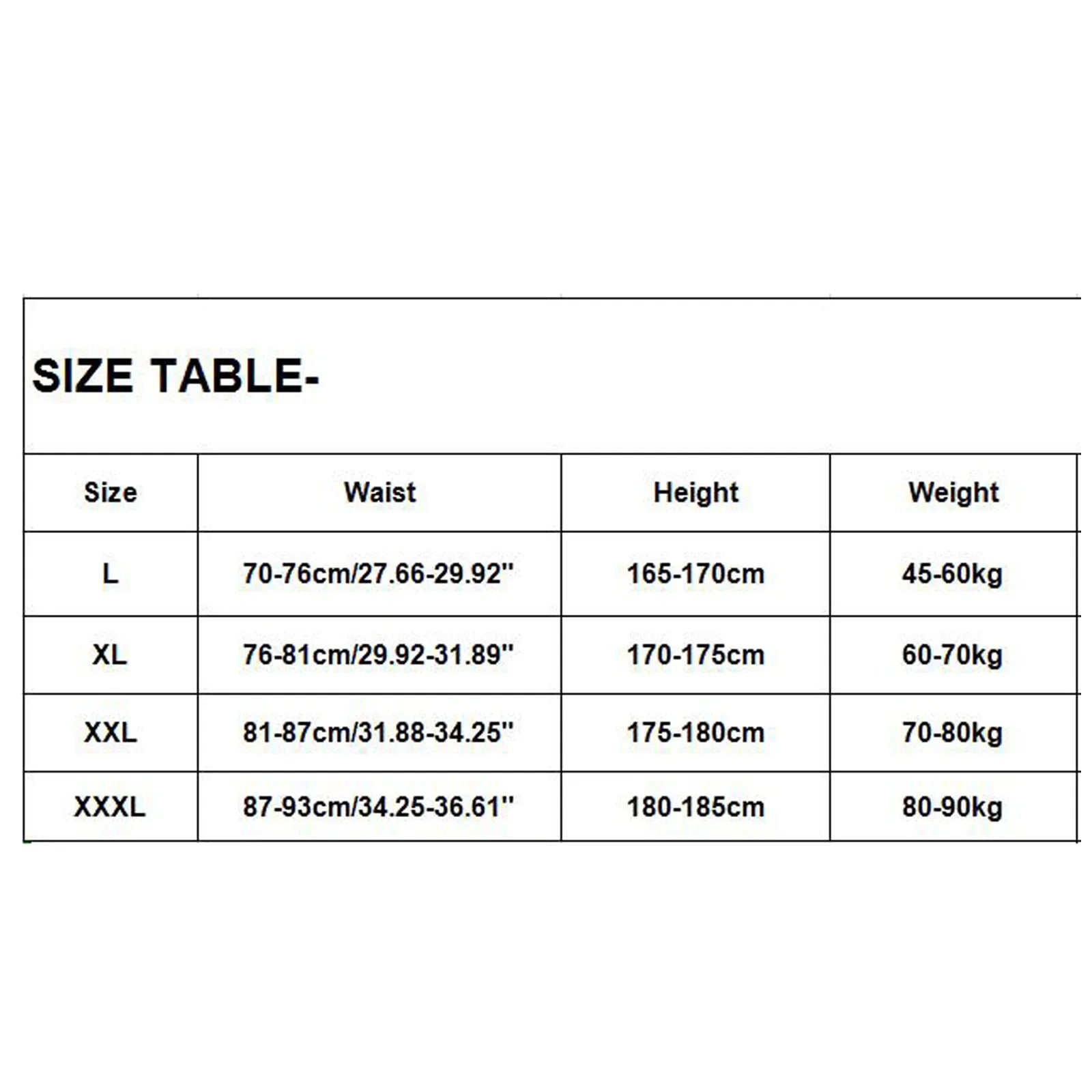 | XXXL | 87-93cm/34.25-36.61'' | 180-185cm | 80-90kg |