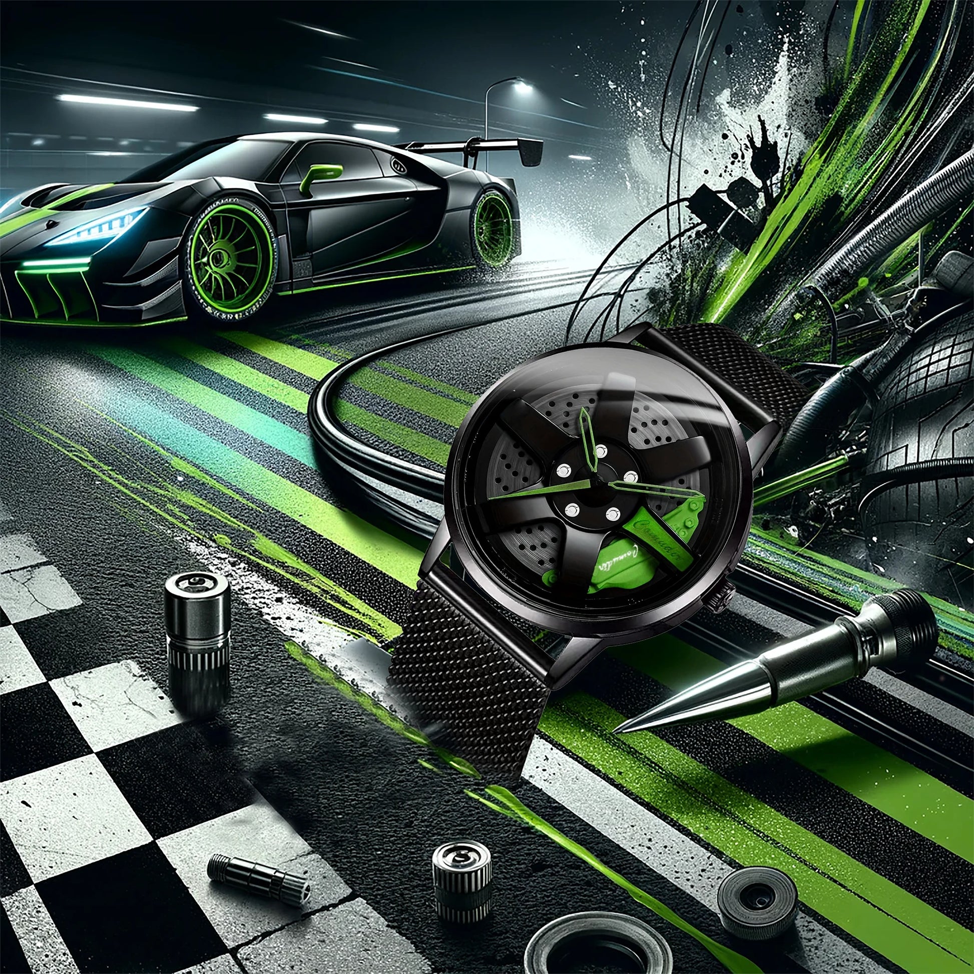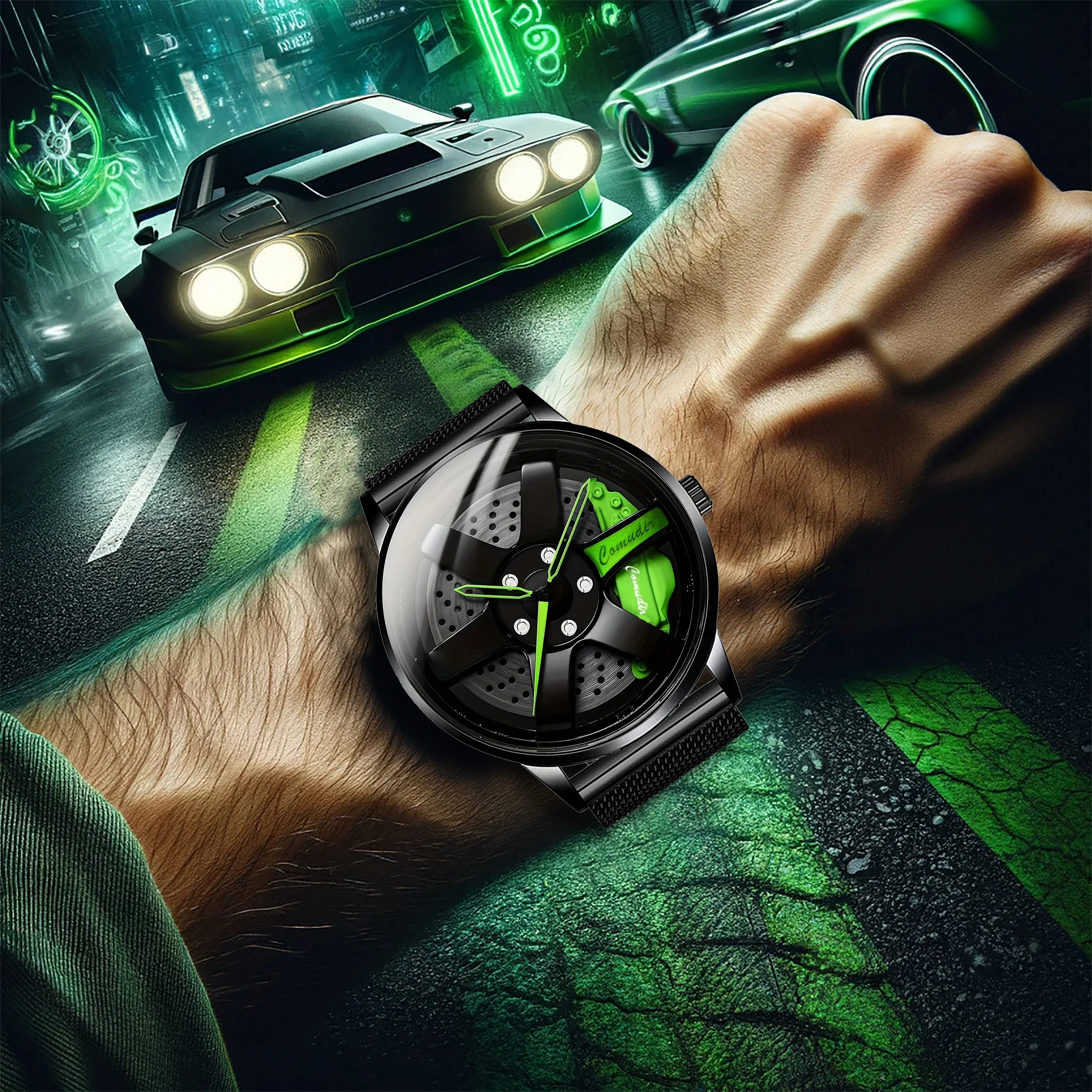 New men's watch with sporty and trendy wheel design, high aesthetic and fashionable disc, black mesh belt, men's quartz watch