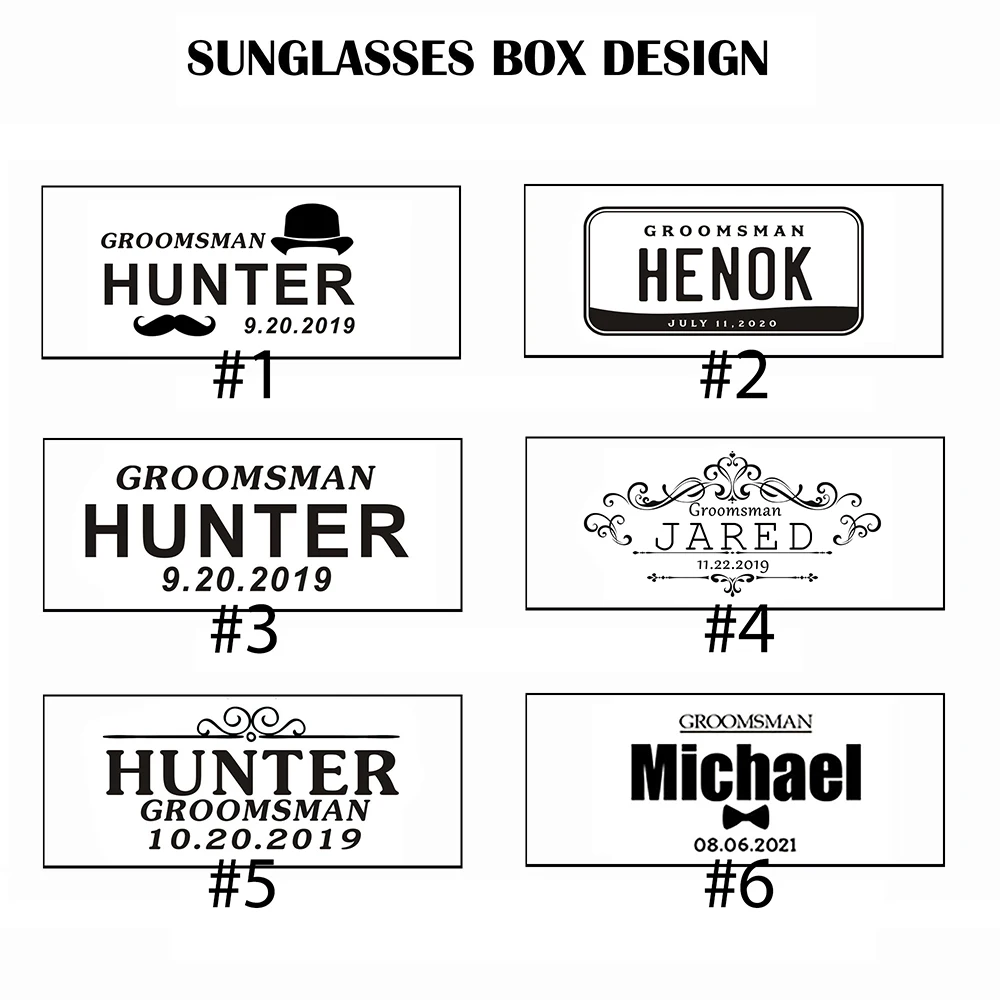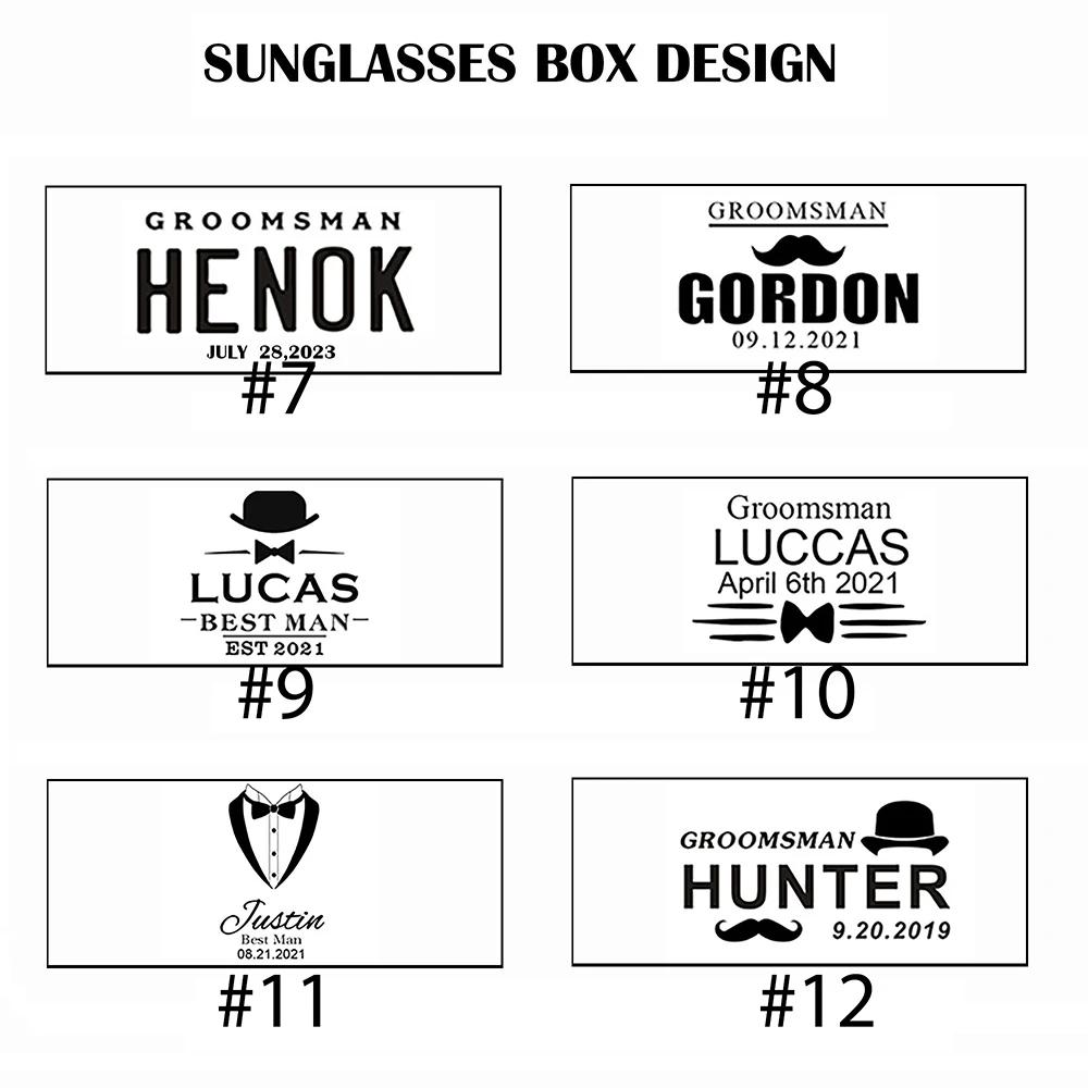 Sunglasses lenses are available in 5 colors for you to choose, namely black-framed black-gray lenses, black-framed mercury lenses, black-framed ice blue lenses, black-framed brown lenses, and black-framed green water lenses. Words can be engraved on the temples of the sunglasses. You can choose the lens color you like when placing an order, then contact us and tell us the customization information, and we will customize it for you.