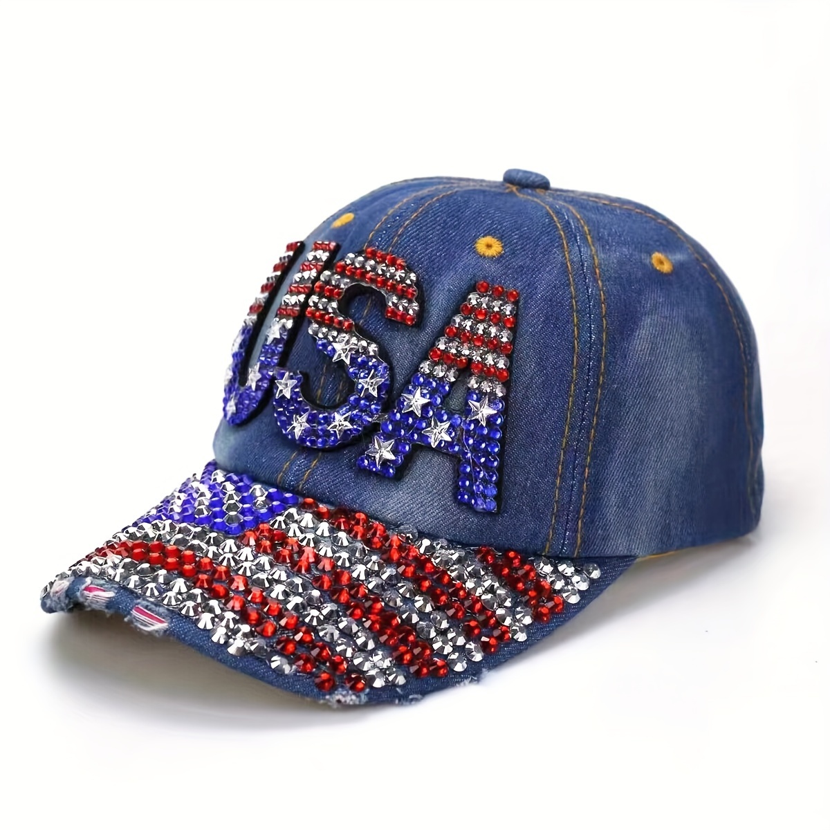 Rhinestone American Flag Embroidered Denim Baseball Cap, U.S.A. Patriotic Caps For Veteran's Day, July 4th Independence Day, Hats For Men&Women
