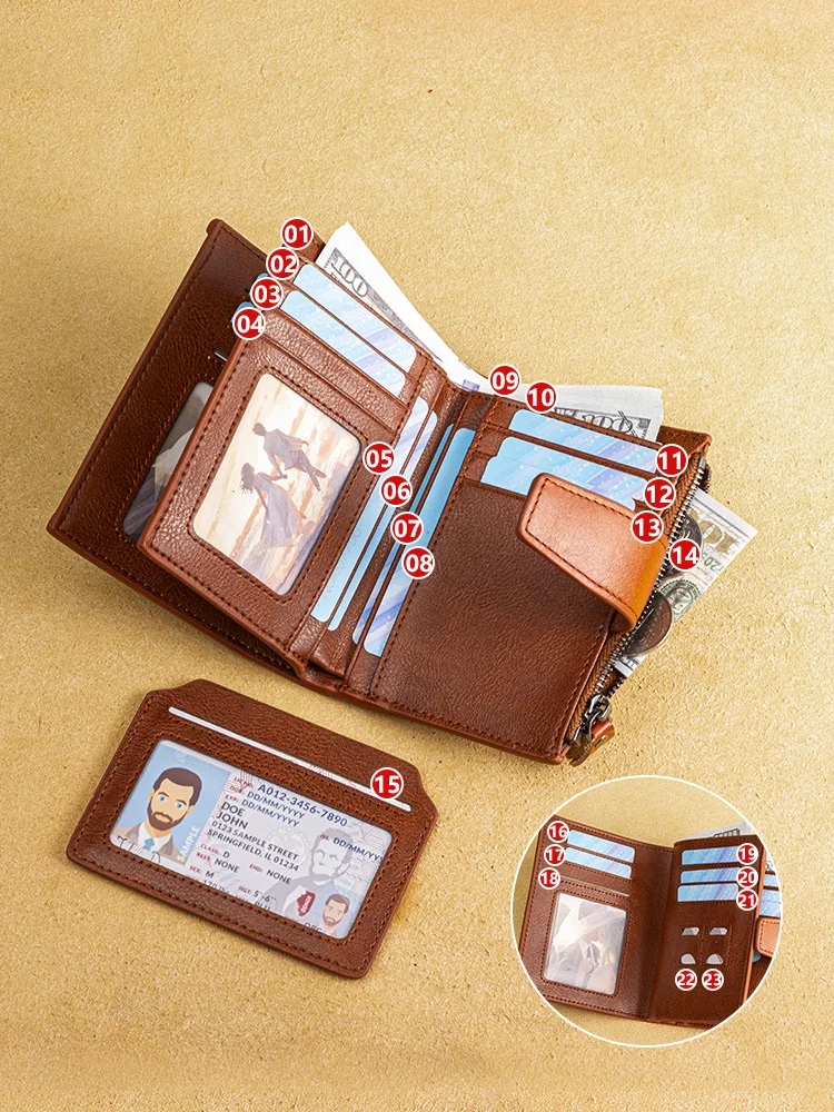Interior: Photo Holder,Interior Zipper Pocket,Zipper Poucht,Coin Pocket,Interior Key Chain Holder,Interior Compartment,Interior Slot Pocket,Note Compartment,Card Holder