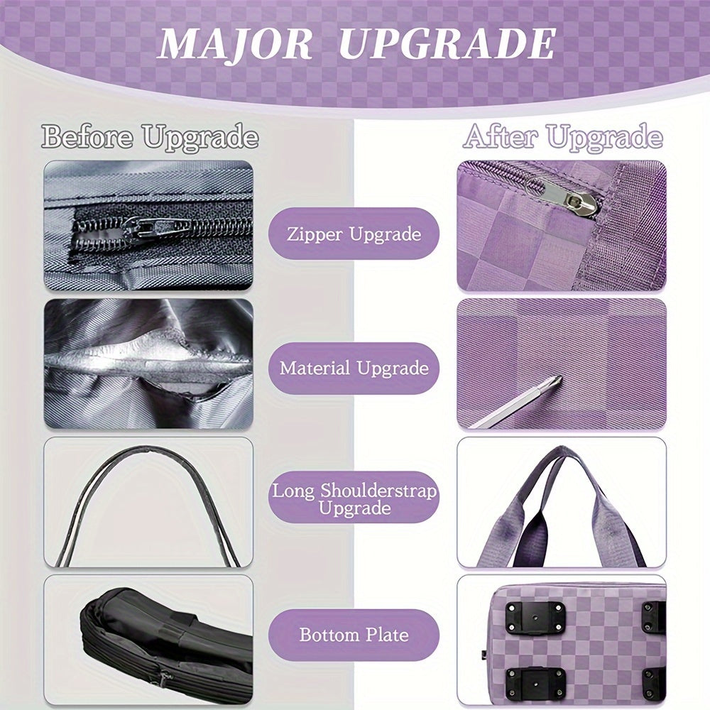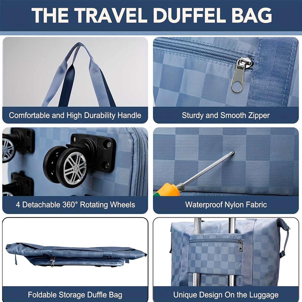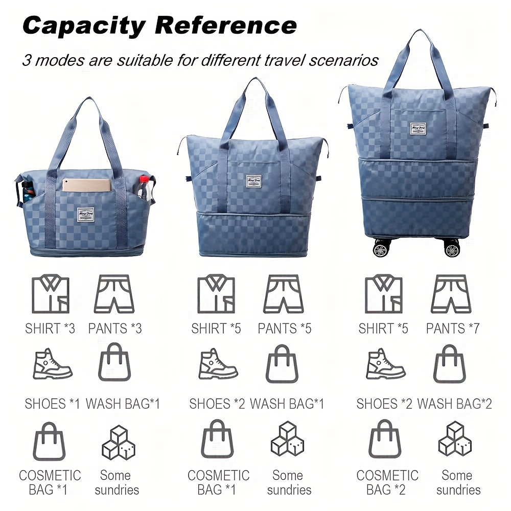 Versatile Expandable Travel Bag with Wheels - Large Capacity, Foldable Nylon Luggage in Checkered Design, Dry/Wet Separation, Fits Trolley Cases, with Adjustable Straps for Sports, Fitness & Moving - Available in Multiple Col