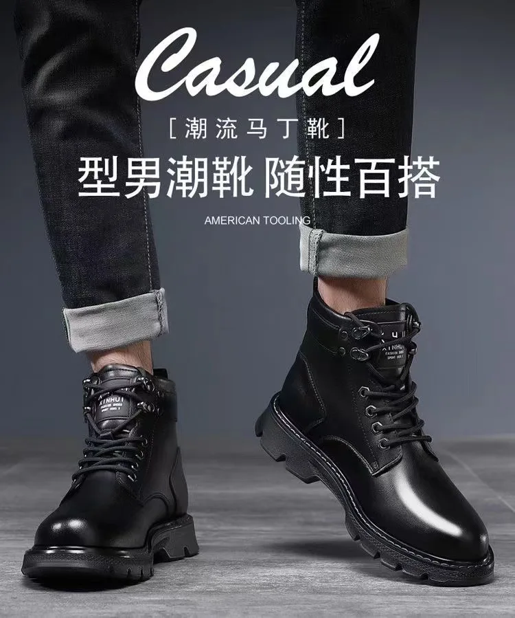 Winter Men's High Top Boots Trendy Black Motorcycle Boots Outdoor Warm Platform Boots Men Lace-up Leather Boots Bota Masculina